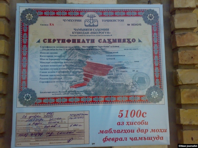 Таблиғ ва фурӯши нахустин саҳмияҳо барои бунёди нерӯгоҳи барқи обии Роғун дар Тоҷикистон дар моҳи январи соли ҷорӣ оғоз ёфт. Ин саҳмияҳо дар маҷмӯъ ба миқдори 6 миллиард сомонӣ таҳия шудааст. Қарор аст, ки давлати Тоҷикистон ба миқдори 4,5 миллиард сомонӣ саҳмияҳои Роғунро худаш харидорӣ карда, саҳмияҳои боқимондаро ба шаҳрвандони тоҷик бифурӯшад.