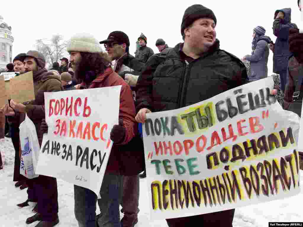 The rally in downtown Moscow on December 26 was organized by civil groups in reaction to rioting on December 11 when thousands of nationalists and football fans poured into the streets chanting, "Russia for Russians."