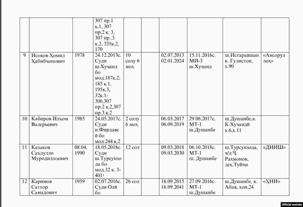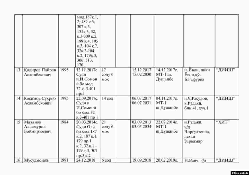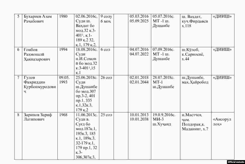 Феҳрасти кушташудагон дар ошӯб дар зиндони Ваҳдат