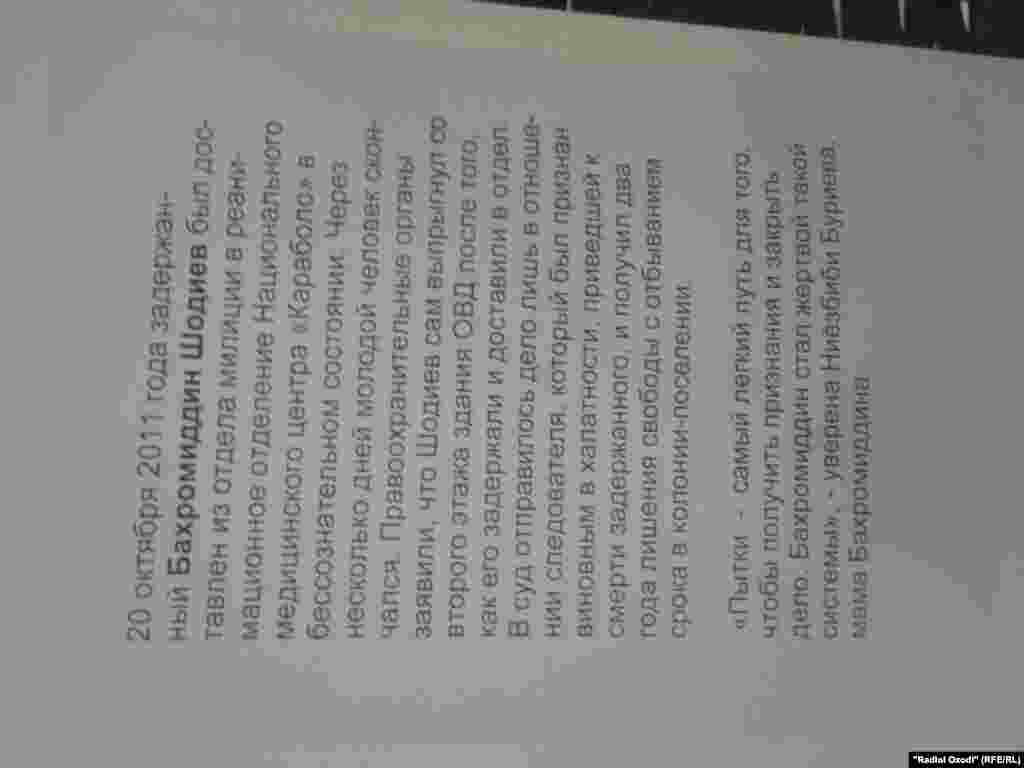 26 июн Рӯзи ҷаҳонии мубориза бо шиканҷа аст. Дар арафаи ин Рӯз, 25 июн дар Душанбе бо ибтикори созмонҳои ҳуқуқи башар ва бо ҳузури наздикони онҳое ки дар боздоштгоҳҳову зиндонҳог даргузаштаанд, як намоишгоҳи марбут ба вазъи шиканҷа дар Тоҷикистон доир шуд.